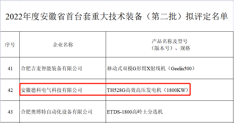 为鼓励和支持首台套重大技术装备的研制和应用,加快我省装备制造业转型升级,推动制造强省建设,根据《安徽省经济和信息化厅关于印发<安徽省首台套重大技术装备首批次新材料首版次软件评定管理暂行办法>的通知》,经企业申报、所在市经信主管部门审核推荐、第三方评定机构组织专家评审、公示等程序,评定米兰网web站TH528G高压高效发电机等116套装备为2022年安徽省第二批首台套重大技术装备。