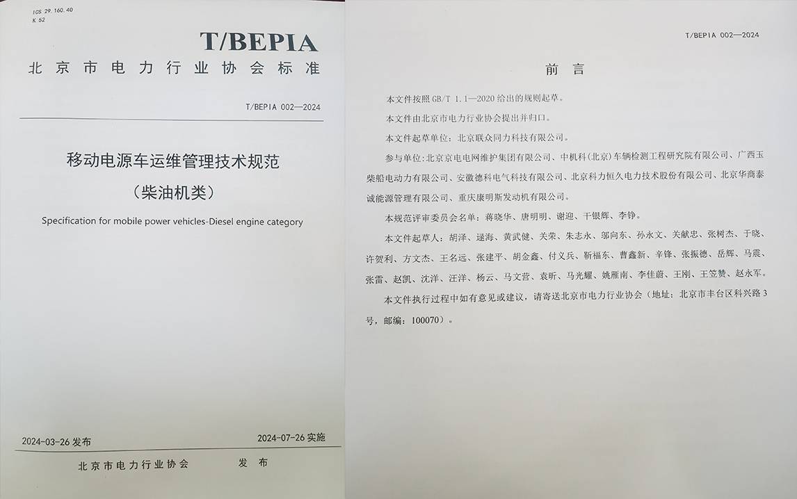 2024年7月26日,《移动电源车运维管理技术规范(柴油机类)标准号:T/BEPIA 002-2024》正式发布实施,该标准由北京市电力行业协会提出,北京联众同力科技有限公司牵头,北京京电电网维护集团有限公司、广西玉柴船电动力有限公司、安徽米兰网web站电气科技有限公司等单位参与起草制订。